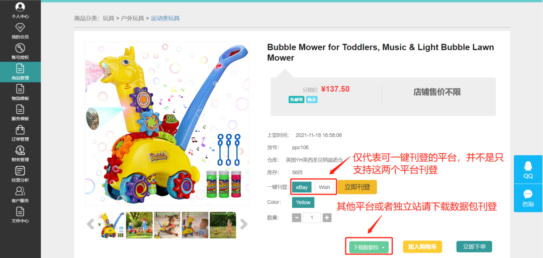 另外,越域网产品详情页一键刊登后的eBay和Wish仅代表可一键刊登的平台,并不是只支持这两个平台刊登,其他平台或者独立站请下载数据包刊登。