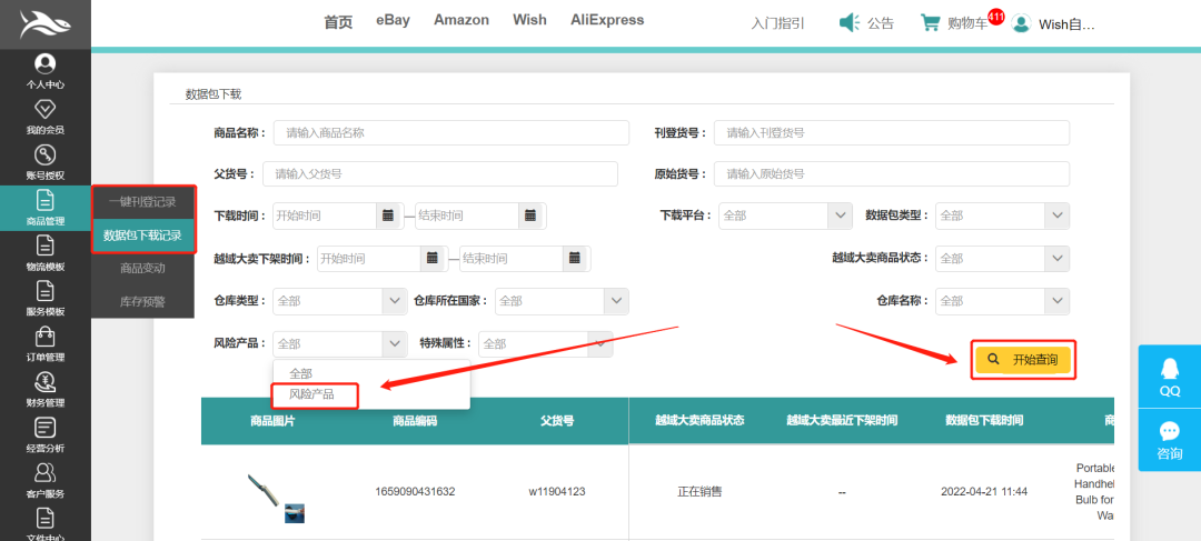 另外,越域网【商品管理—一键刊登记录】和【商品管理—数据包下载记录】都可通过【风险产品】筛选出已经刊登过或者下载过数据包的风险产品,请及时筛查和下架。