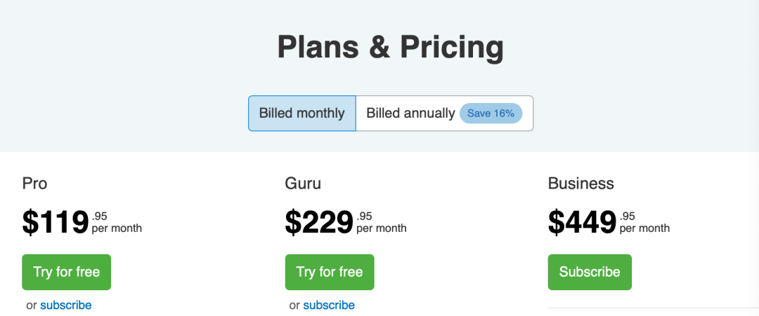Semrush的月费套餐从119.95美金到449.95美金不等,年费价格则有16%的优惠。