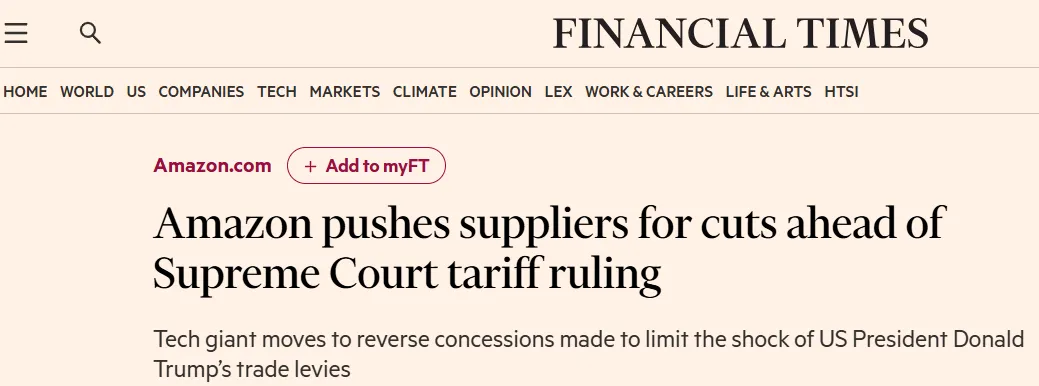 这一动作恰逢美国最高法院即将对特朗普时期关税合法性作出裁决的前夜,被业内视为亚马逊在不确定的贸易环境下,提前进行成本调整的战略举措。