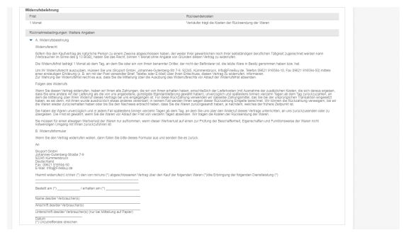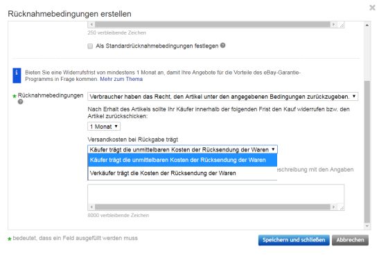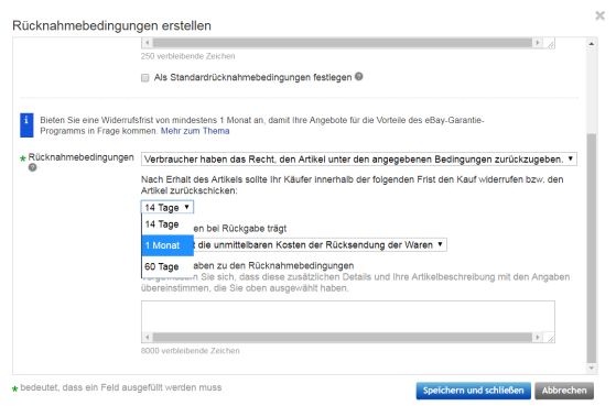 1、填写退货时间:卖家可以选择“vierzehn Tage” (14天) 或者 “einenMonat” (1个月),或"sechzig Tage" (60 天)。 确保退货政策中的退货时间,和在“退货设置(return policy)”设置中的一致。