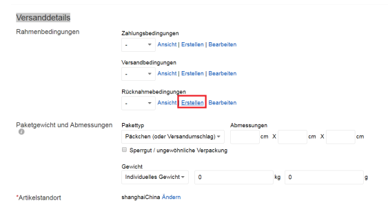 1、在物品刊登界面,选择退换货设置,点击“Rücknahmebedingungen-Erstellen”