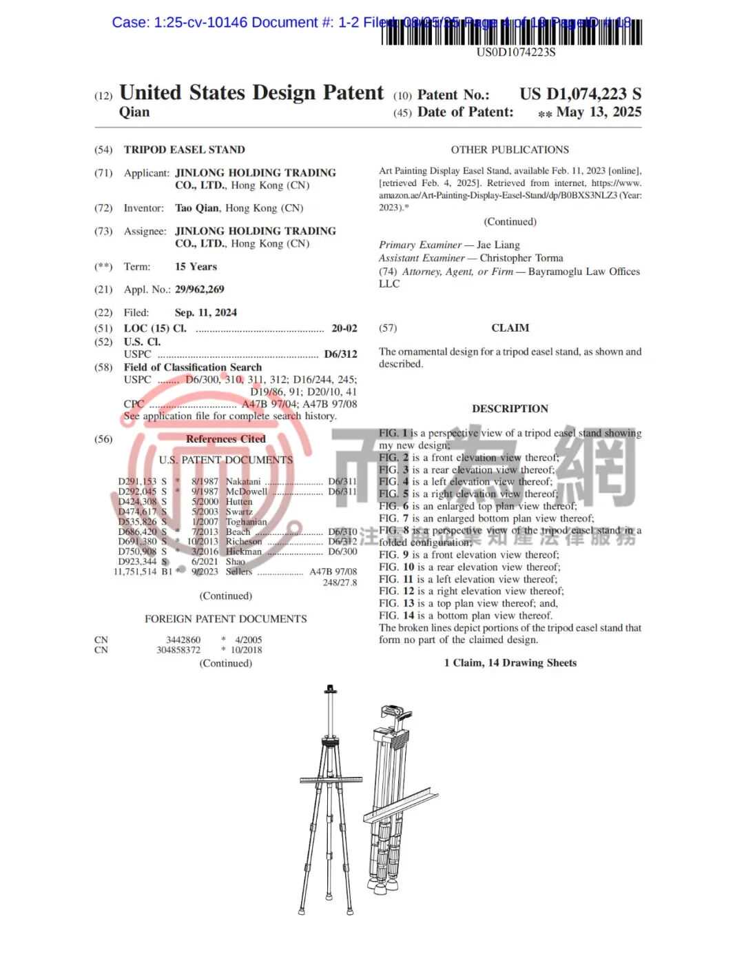 【侵权快讯】25-cv-10146 国人原告三角架画架专利发案维权中!相关产品速排查下架!
