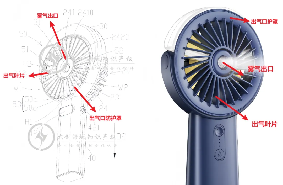 判断实物是否落入对方发明专利:一种喷雾风扇包括:一种风扇组件[20],包括风扇壳体和设置在风扇壳体内的风扇叶片组件,其中,所述风扇壳体包括位于进气侧的进气口防护罩和位于出气侧的出气口防护罩,所述出气口防护罩包括雾气出口部分和围绕所述雾气出口部分环形连接的多个出气叶片;