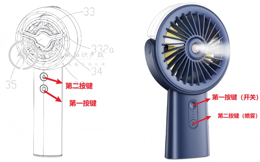 判断实物是否落入对方发明专利:喷雾风扇还包括设置在风扇壳体内的主电路板,以及设置在进气口护罩上并与主电路板电连接的至少一个按键,所述至少一个按键包括第一按键、第二按键;第一按键用于控制风扇叶片组件的开/关和/或气流大小,第二按键用于控制雾化部件的开/关。
