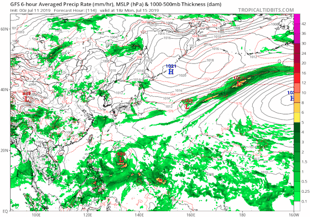 当然,菲律宾东部海域正是30℃高水温海域,有利于台风胚胎或台风的进一步壮大。GFS模拟显示,5号台风18日还登陆了菲律宾北部,19日来到了我国南海北部。与此同时,另外一个台风胚胎的最低气压数值也降低到了998百帕附近,也属于一个热带风暴级的新台风了,按照先后命名原则,5号已生成,这个又将是我们的6号台风“百合”了。