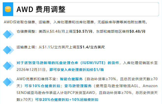 此外,AWD 仓储费西部涨至0.57美元 / 立方英尺,东部和南部涨至0.48美元 / 立方英尺,运输费统一涨至1.4美元 / 立方英尺。