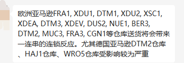 目前欧洲亚马逊FRA1, XDU1, DTM1, XDU2, XSC1, XDEA, DTM3, XDEV, DUS2, NUE1, BER3, DTM2, MUC3, FRA3, CGN1等仓库送货将会带来一连串的连锁反应。尤其德国亚马逊DTM2仓库、HAJ1仓库、WRO5仓库受到的影响较为严重。