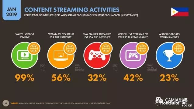 99%菲律宾互联网用户在线观看视频,32%用户直播玩游戏,42%观看游戏直播,23%观看电竞游戏。