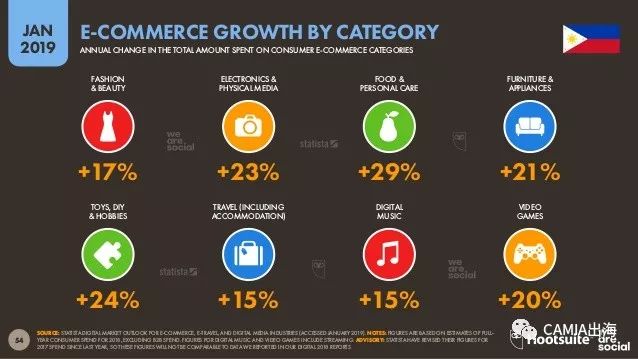 2018年菲律宾消费者在电商的投入明显增加。其中在时尚类的投入高达2.03亿美元,较上一年相比增长17%。电子设备类2.34亿美元,增长23%。食品/个护类1.27亿美元,增长29%。家居类1.48亿美元,增长21%。玩具/创意类1.28亿美元,增长24%。旅游类35.42亿美元,增长15%。数字音乐类3500万美元,增长15%。视频游戏类1.19亿美元,增长20%。