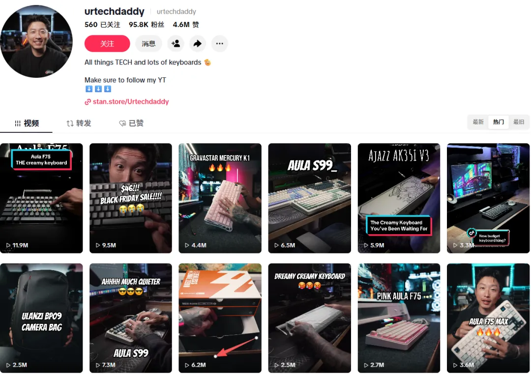 以 @urtechdaddy 的视频为例,账号约9.5万粉,属于科技外设垂类中腰部KOL。视频上线约3个月,播放620万、点赞6.6万。
