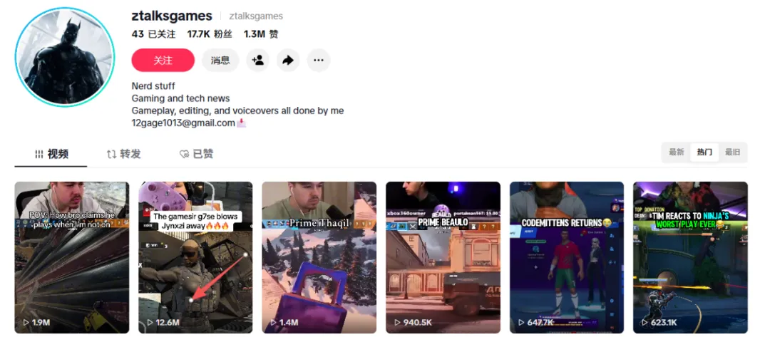 在TikTok上建立账号矩阵,作为“放大器”角色。累计约100万粉,以15–30秒短视频为主,高频更新。内容核心围绕“实战画面+功能结果”,将抗漂移、低延迟等技术能力,直接转译为游戏中的操作优势。同时通过电竞选手、比赛节点与产品绑定,让内容具备天然的话题性与传播性,快速建立认知与兴趣。