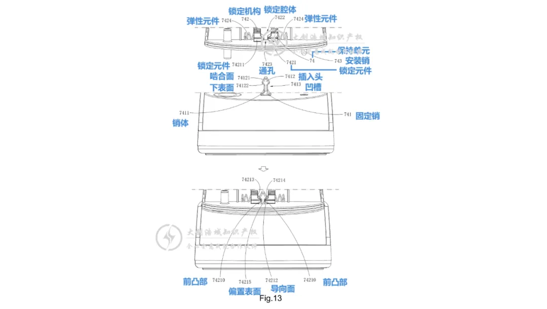 锁定原理:包括从座式水箱部伸出的止动销,以及与底座壳体相连的锁扣机构。锁扣机构内部设有一个带开口的锁定腔,供止动销插入。止动销前端设有插入头,锁扣机构内部有两个用于控制进出锁定腔的锁扣件,以及分别连接这两个锁扣件的弹性件。当止动销的插入头通过开口进入锁定腔后,即可完成锁定。