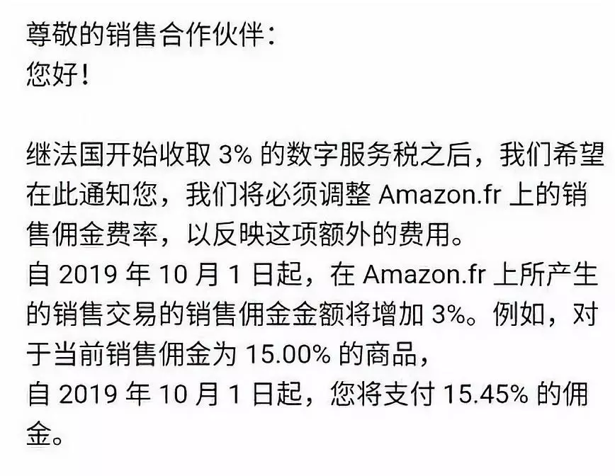 根据亚马逊卖家的说法,他收到了亚马逊的电子邮件。法国站的销售佣金率上升了3%。原因是法国开始收取3%的数字服务税。详情如下图所示: