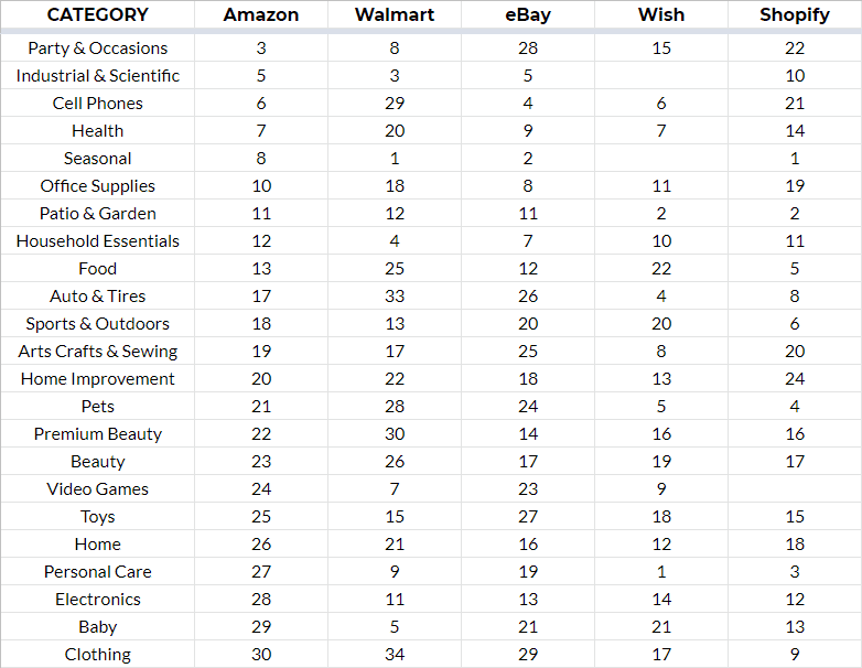 每逢旺季都有哪些热卖的品类?我们来看一下2020年各跨境电商平台哪些品类在旺季增长最快。下表中的数字代表周转速度排名,数字越小,周转增长速度越快。