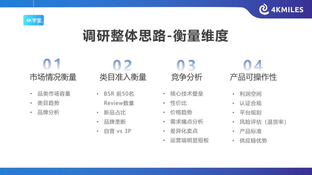我们进行旺季选品调研可以从市场情况衡量、类目准入衡量、竞争分析、产品可操作性这四个衡量维度入手。