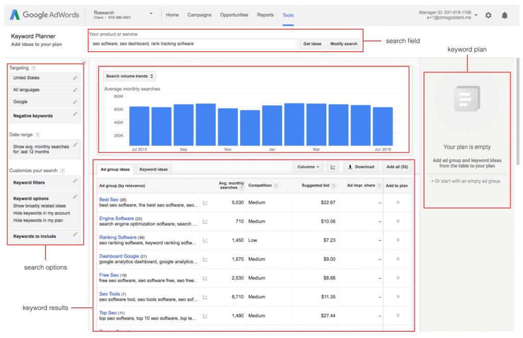 Google Keywords planner只有你使用了Google Adwords你才可以使用。是Google的官方关键词工具。外界的关键词工具数据来源基本都是来自于Google Keywords planner的数据。