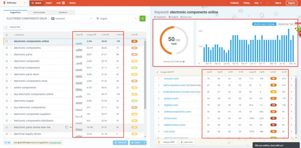 Kwfinder是一个付费关键词工具,价格还公道,比以前便宜多了。基础版的$29.9一个月,每天可以分析100个关键词。你输入关键词,出先相关关键词的数据,同时还给这个关键词难度打分,50分以上的是比较难的词。最后给出SERP页面,给TOP 10 SERP页面做一个分析!非常适合内容站。
