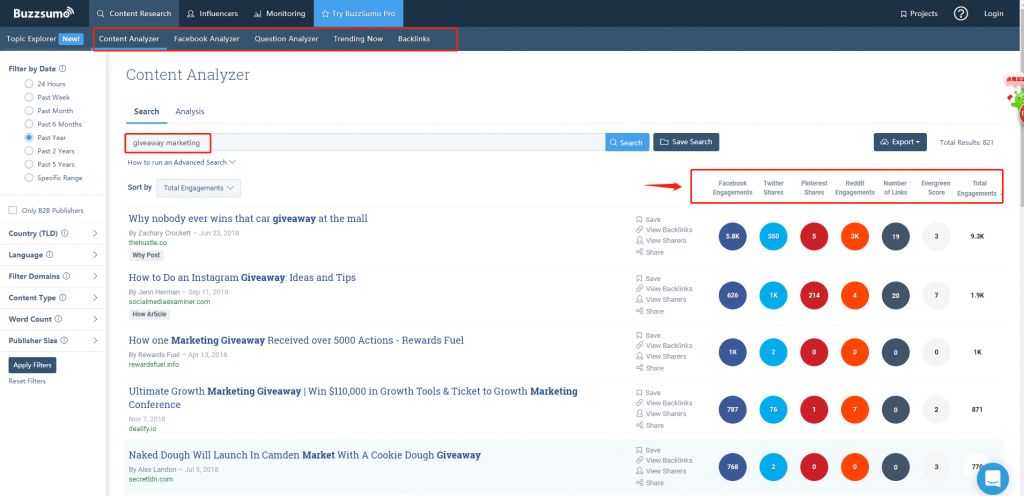 Buzzsumo可以帮助你找到你想找的内容相关的最火的文章!搜索“giveaway marketing”,你就可以看到在社媒里最火的文章(按社媒总分享次数排名)。然后你就可以分析这些文章为什么这么火,会给你带来很多收获!