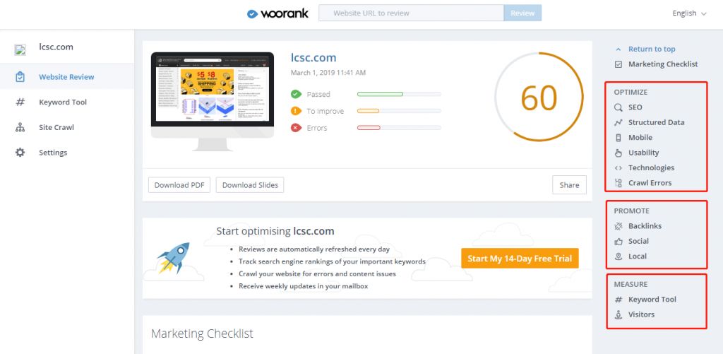 SEO审计就是看看你网站SEO做的怎么样?哪里做的好,哪里不好,怎么改进等!Woorank还是很不错的审计工具,一些Fiverr上的审计服务还要$5-$20,其实就是用的这个。SEO Powersuit里也有审计工具,非常好用。