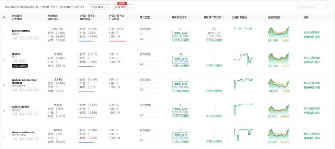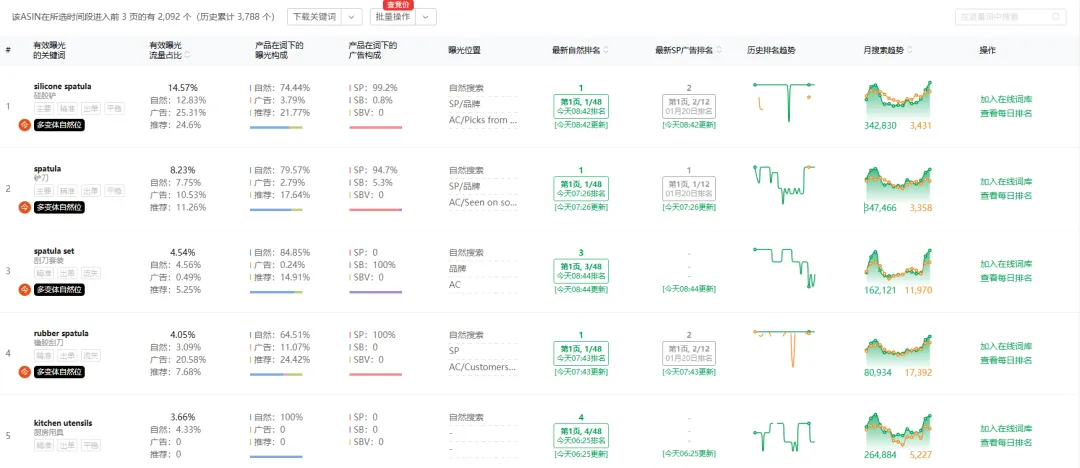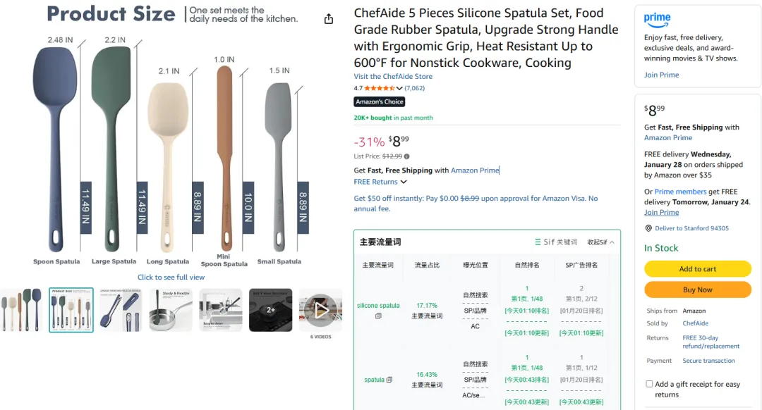 2026年1月(现在-销量维持期):为了维持高销量,它必须覆盖 Spatula、Kitchen tools 这种大流量词。虽然竞争大,但它权重够硬,吃得下。
