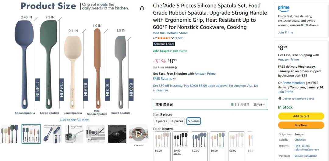 如果你现在(2026年1月)去反查它的关键词,你会发现它占据的都是超级大词:Spatula (刮刀)、Kitchen Utensils Set(厨房用具套装)、Cooking Gadgets (烹饪小工具),人家在这个词上转化率高,是因为有几千个Review和长期稳定的销量权重背书。