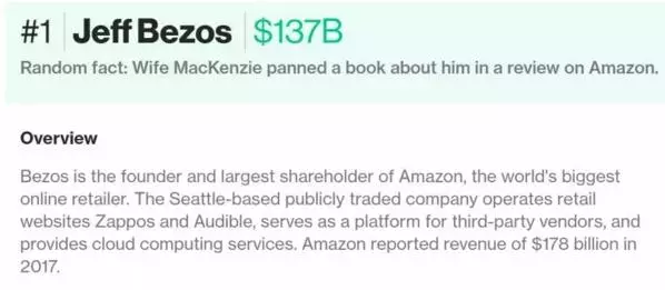 作为世界首富,根据彭博社实时数据(截至美国时间1月9日),贝索斯的财富约1370亿美元。