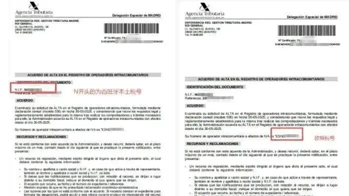西班牙本土 VAT(N 开头):仅用于西班牙本地清关、本地申报与销售,无法支持泛欧跨区销售。