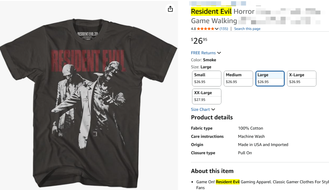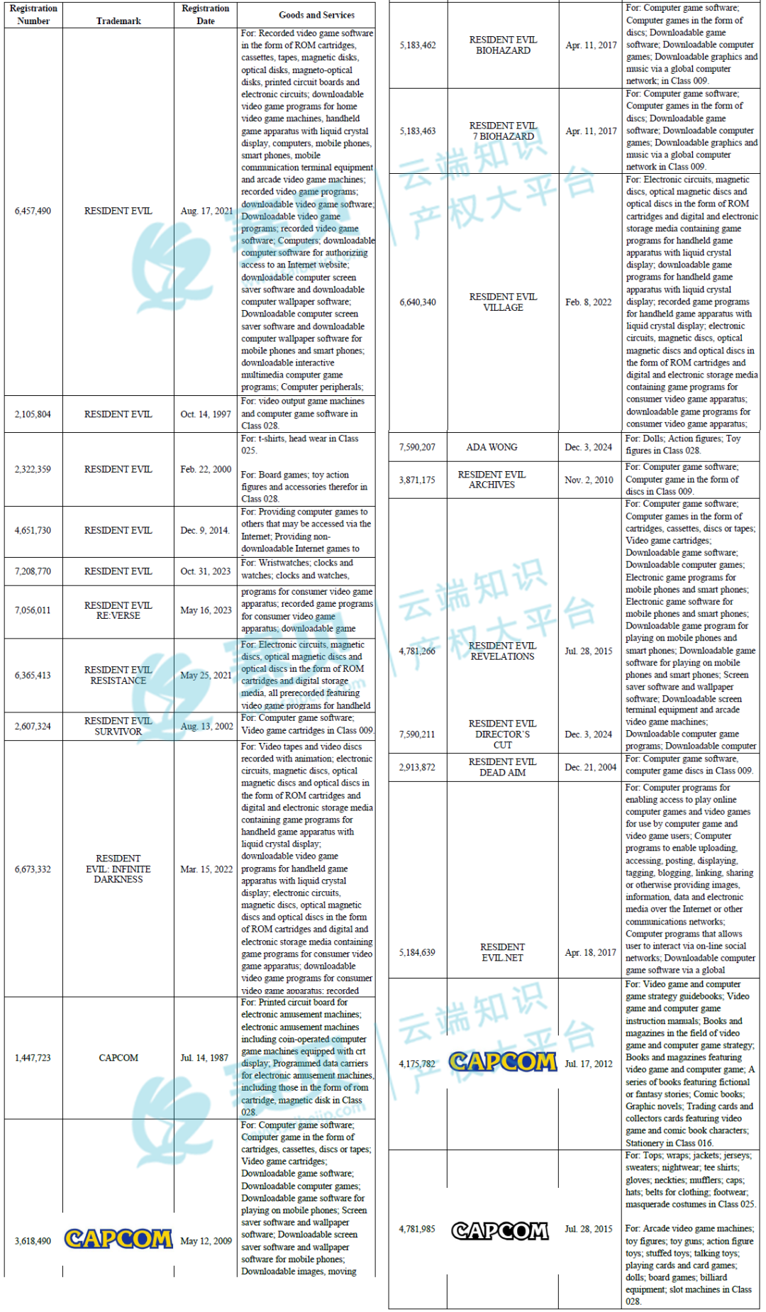 案件涉及多个美国注册商标,如“RESIDENT EVIL”系列(含“BIOHAZARD”“VILLAGE”“ADA WONG”等),涵盖类别包括:第9类(游戏软件等)、第14类(手表等)、第25类(服装鞋帽)、第28类(玩具等)、第41类(在线游戏服务等)。赛贝提醒:未经授权,卖家不得使用或近似使用上述商标,否则可能构成侵权。