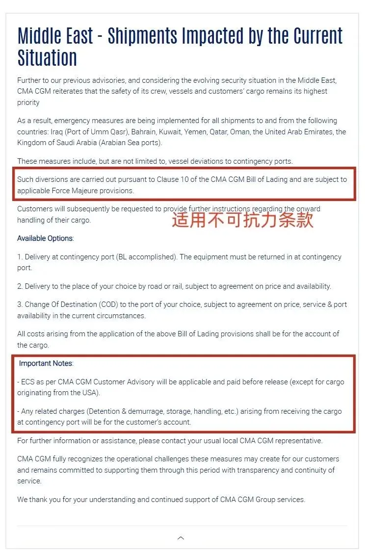 船公司公告显示,后续将对相关货物执行船舶改道、备用港口紧急卸货、航线运营调整等安排,并依据不可抗力条款执行后续操作。