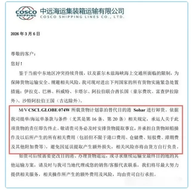 MVCSCLGLOBE 074W 航次货物将改至阿曼苏哈尔港(Sohar)卸货。根据提单条款,承运人责任于货物卸港后即终止。货方须自行安排提货,并承担卸船后产生的全部费用与风险,包括港口费用、仓储费、短驳费、滞期费及其他相关附加费用。如需变更目的港、办理退运或安排后续运输,由此产生的操作费用与风险同样由货方承担。
