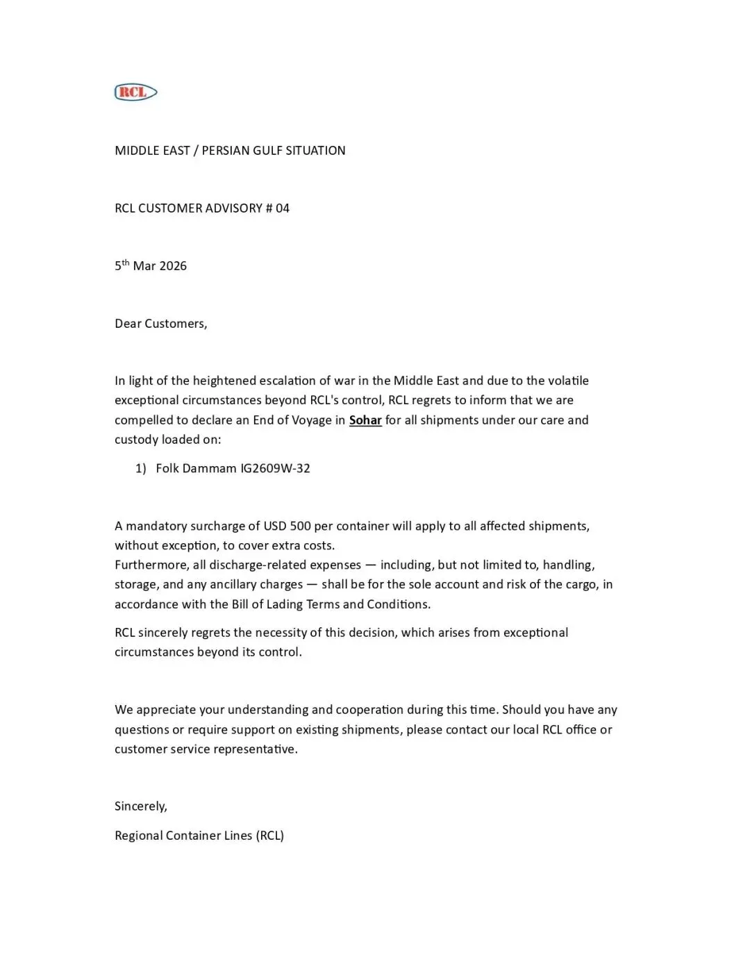 05 宏海箱运(RCL):将征收附加费,相关费用全额由货方承担