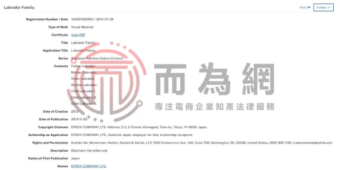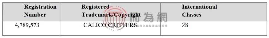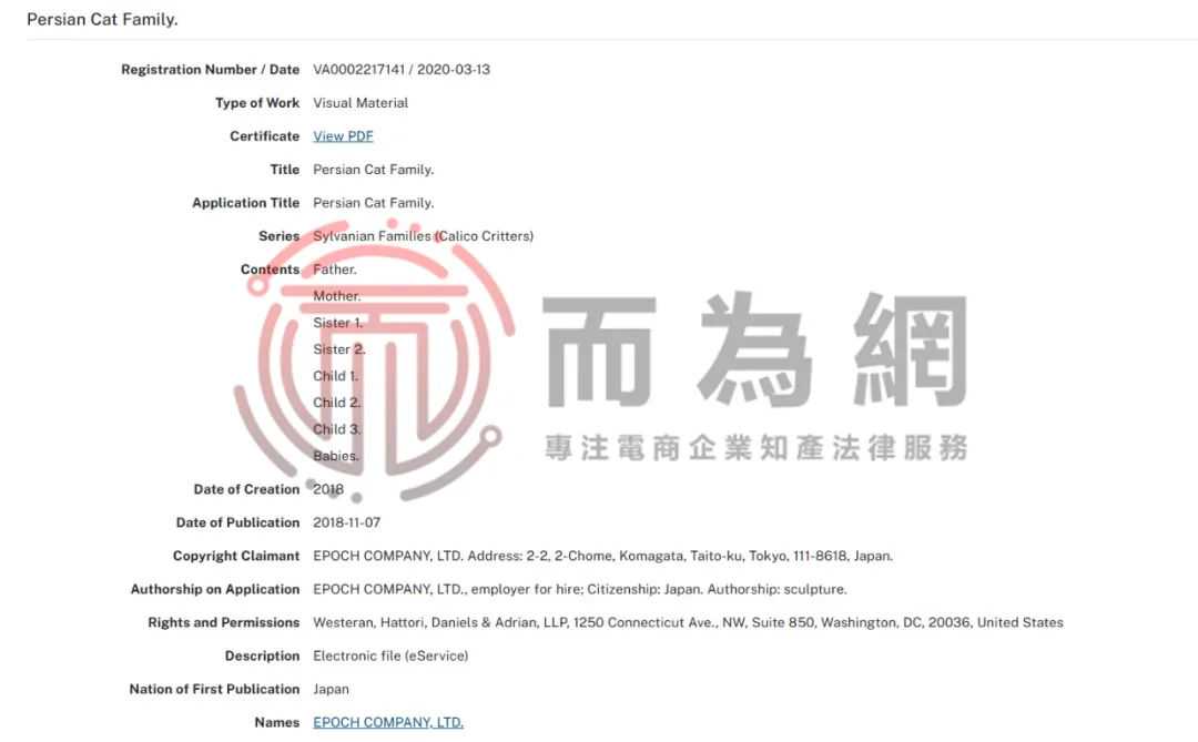 由于本案涉及的版权图片暂未公开,以下是小为根据版权号查到的版权信息供卖家们参考,未经授权CALICO CRITTERS的主要角色不能擅自使用,否则会有侵权风险!