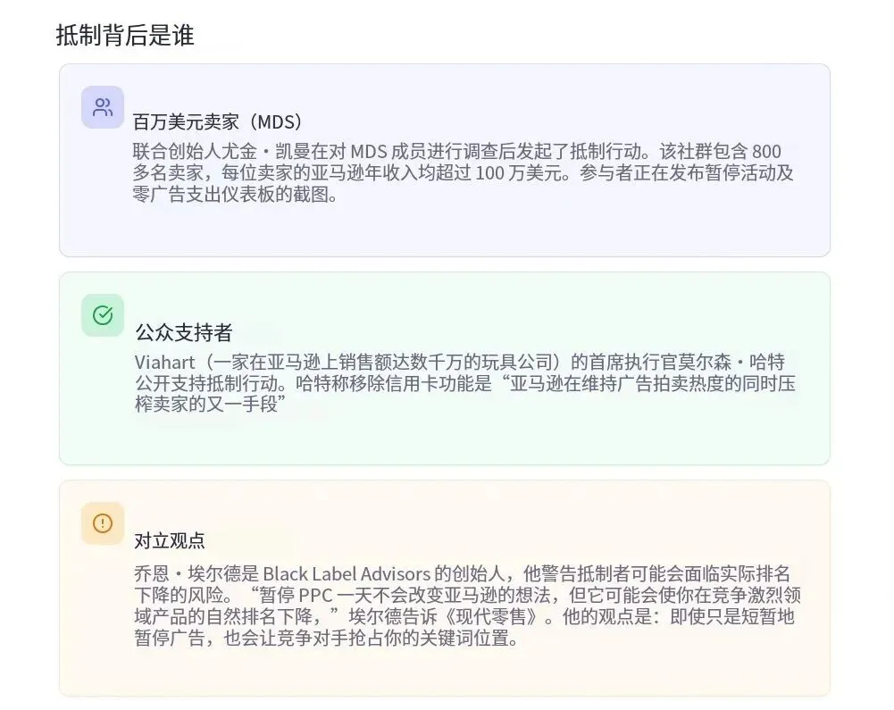 反对方则提醒,卖家暂停广告会导致产品搜索排名下滑、市场份额被竞品抢占,甚至有担心亚马逊对参与抵制的卖家进行秋后算账。