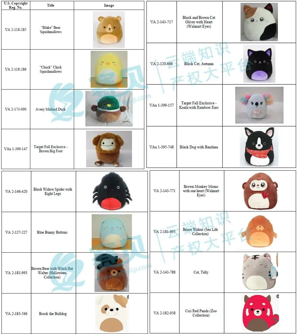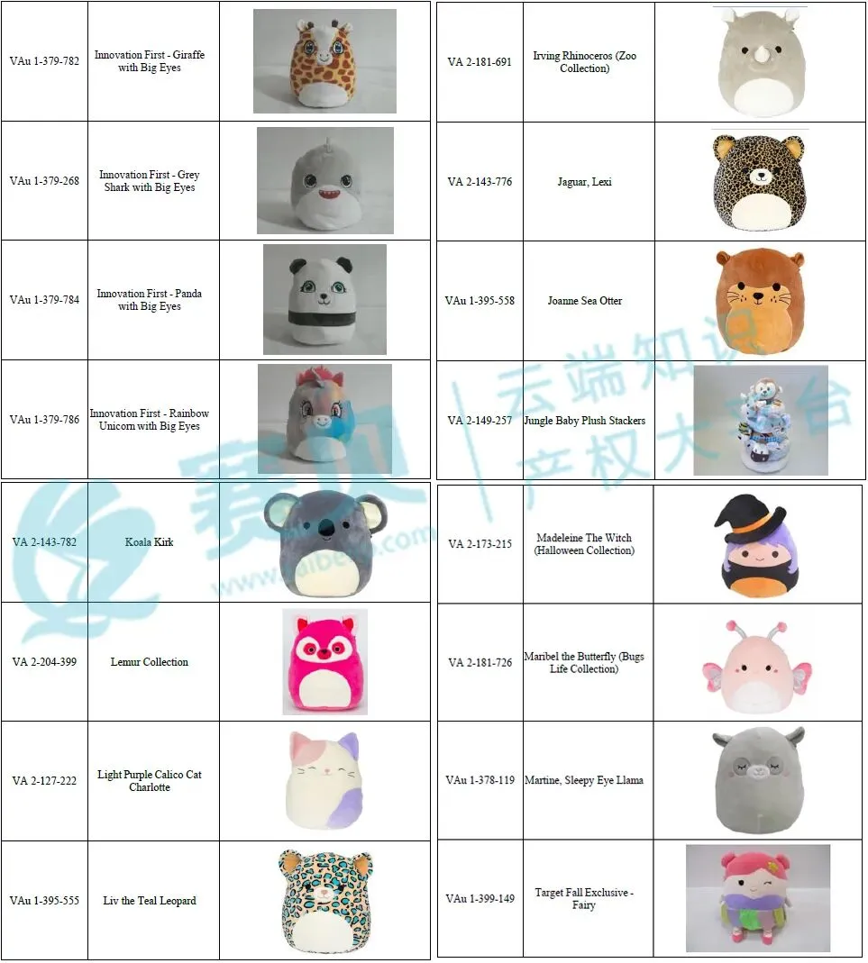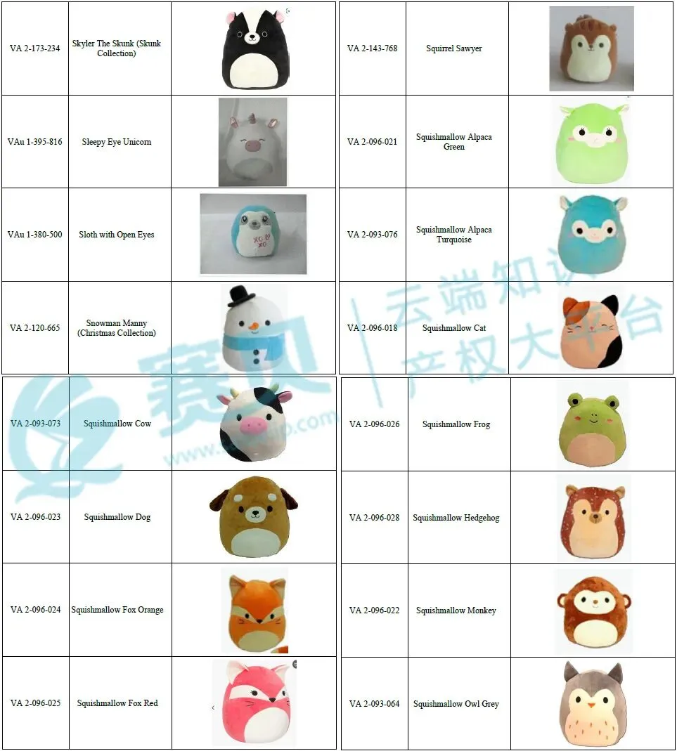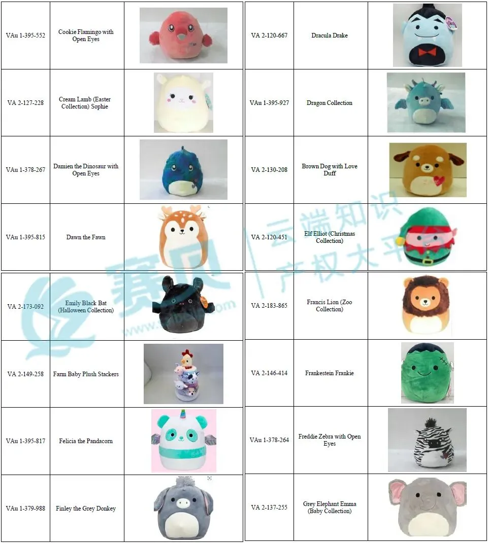 案件涉及原告美国注册的版权“Squishmallows Copyrighted Works”,涵盖Squishmallows系列产品上百个具体形象设计,含多主题系列,原告享有复制、发行、展示及制作衍生作品独占权。