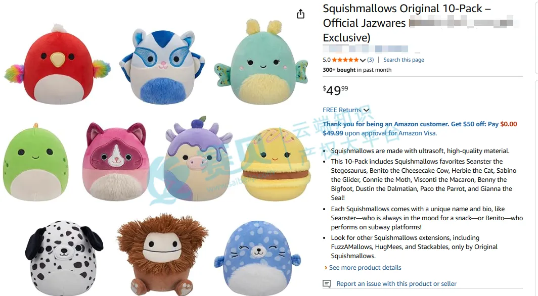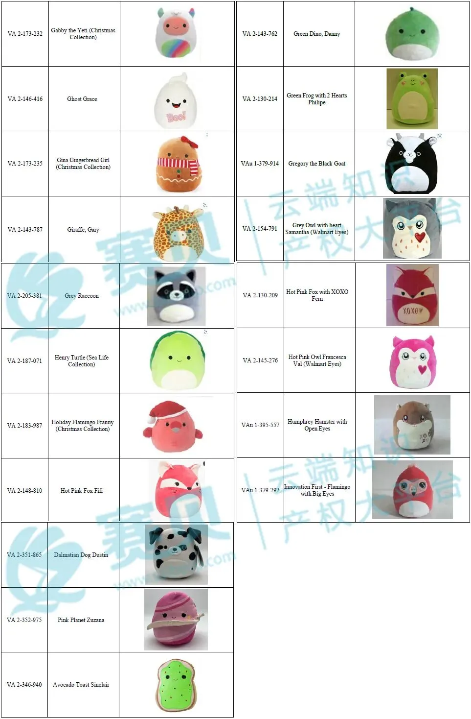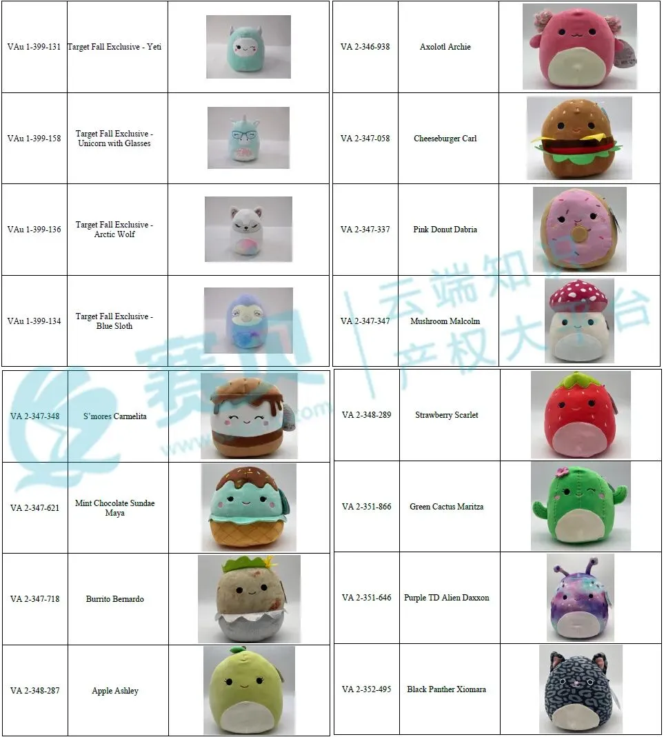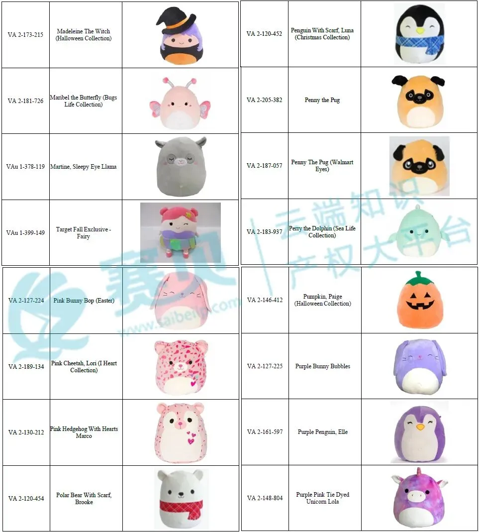 案件涉及原告美国注册的版权“Squishmallows Copyrighted Works”,涵盖Squishmallows系列产品上百个具体形象设计,含多主题系列,原告享有复制、发行、展示及制作衍生作品独占权。