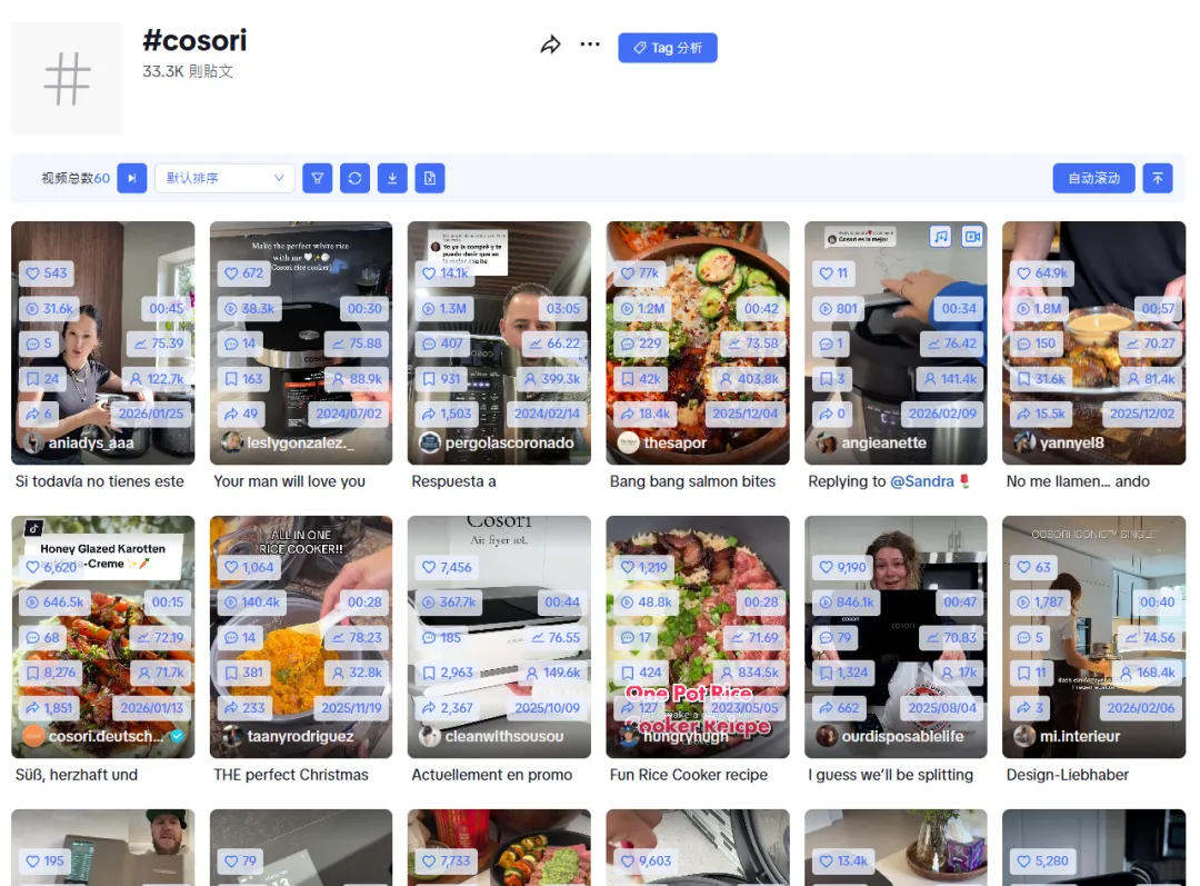 COSORI没有选择请明星代言,也没有投放昂贵的硬广,而是精准抓住了海外社媒的风口,布局TikTok、YouTube等主流平台,采用“分层红人矩阵+真实内容种草”的方式,打破偏见,建立信任。