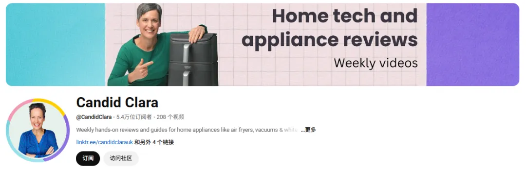 而在YouTube上,COSORI则重点合作垂直家电测评红人,比如@CandidClara,这位博主是家电测评专家,77%的内容聚焦厨房小家电,其中46%是空气炸锅测评,粉丝都是“理性决策、注重品质”的用户,正好契合COSORI高端系列产品的定位。