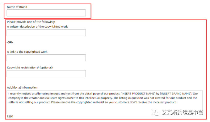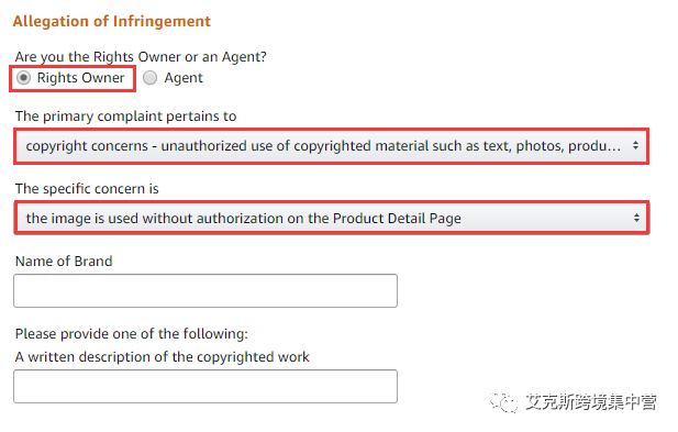 选择Rights owner(产权所有人)再选择Copyright concerns(产权疑虑)最后选择the image is used without authorization on the Product Detail Page(商品详情页面上的图片未经授权被盗用)