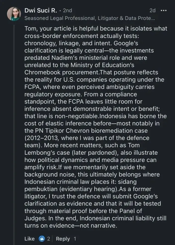 谷歌的澄清在法律上是关键性的 - 相关投资发生在Nadiem出任部长之前,且与教育部的Chromebook采购并无关联。这一立场,真实反映了美国公司在印尼的《反海外腐败法》(FCPA)框架下的处境:即便只是‘被感知到的模糊性’,也可能带来监管风险。
