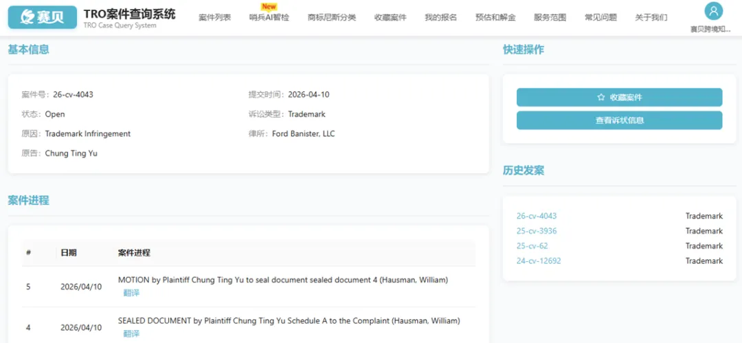 从赛贝TRO案件查询系统获悉,原告为香港个人CHUNG TING YU,于2026年4月10日向美国伊利诺伊州北区联邦法院提起诉讼,核心维权范围涵盖第14类珠宝首饰、第35类珠宝零售服务,涉案产品包括项链、手链、手表等多种珠宝饰品。原告维权意识强,每年都会发TRO起诉涉嫌侵权的跨境卖家。