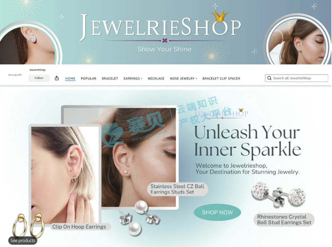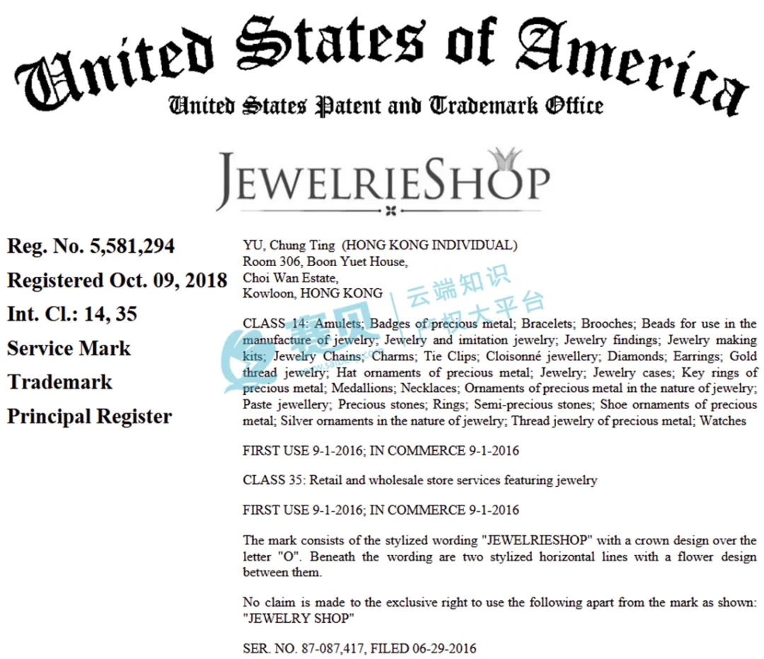 涉案商标为JEWELRIESHOP,美国联邦商标注册号为5,581,294,注册日期为2018年10月9日,赛贝提醒跨境卖家,未经授权不得擅自使用,以免引发侵权风险。