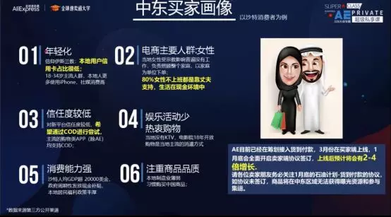 E、 文化差异:由于中东地区80%的电子商务采用货到付款的方式,而且“尾程派送”的送货团队中最好要有女士,女士就会在空运后的第一时间把货物交给较为保守的家庭。