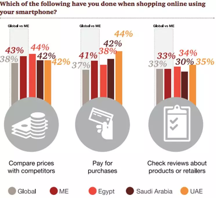 B、 使用社交媒体购物的占比率较高: 根据PWC的一项报告显示,56%的中东购物者觉得手机将成为他们网上购物的主要方式,也有41%的中东购物者早已经使用智能手机进行购物。