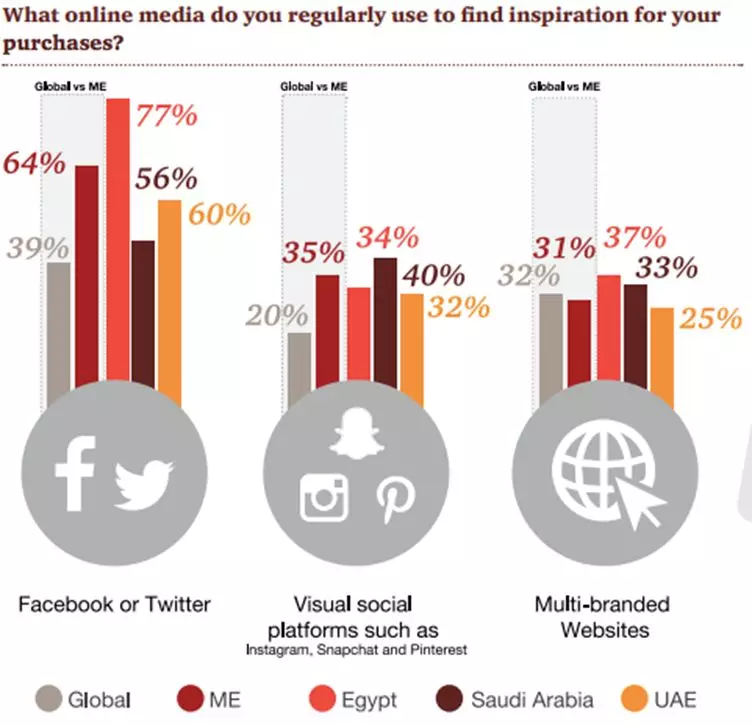 与此同时,根据PWC的数据显示,也有64%的中东购物则使用Facebook 或者 Twitter找到心仪的事情进行购物。另外,在Instagram上发放广告也是电子商务零售商进入中东市场的有效途径之一