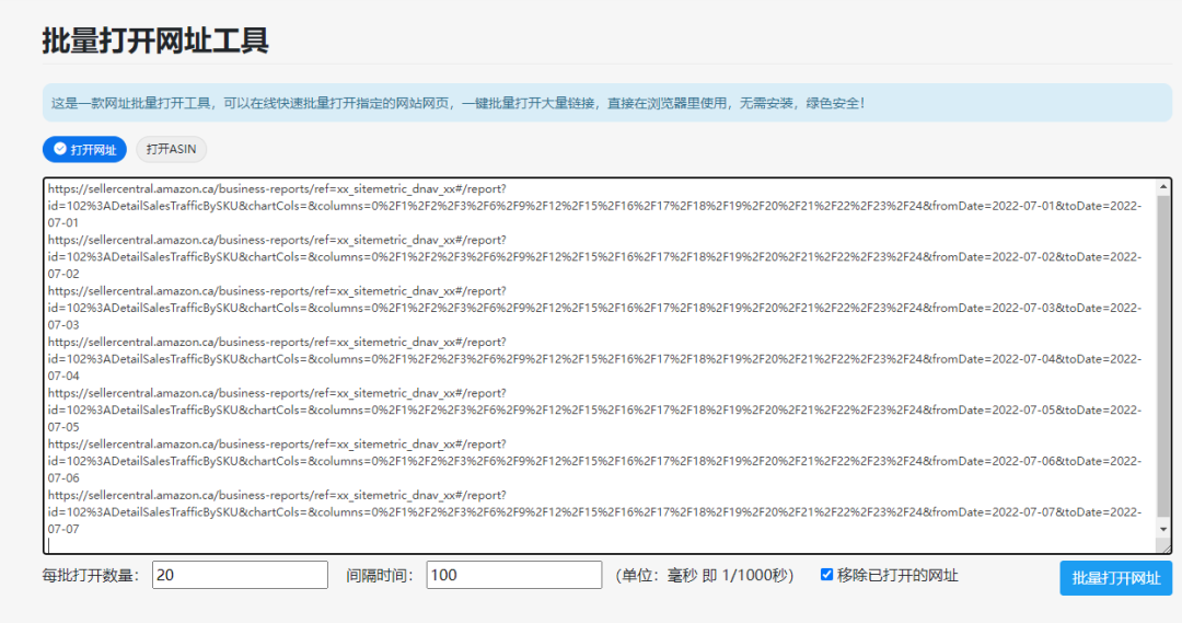 大家的浏览器不同,所以可以直接用amz123这个在线批量打开网址功能:https://www.amz123.com/tools-piliang