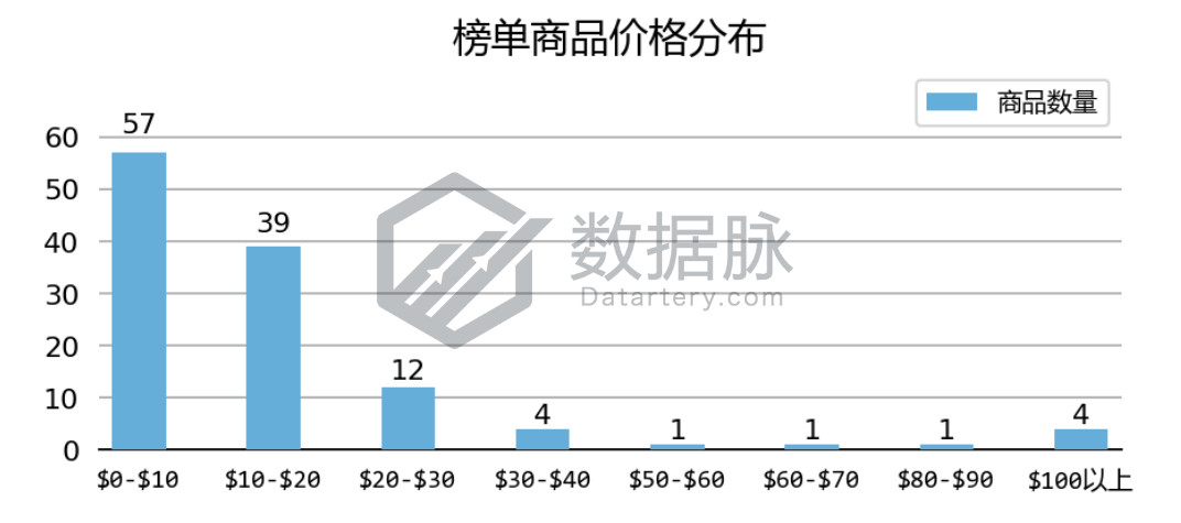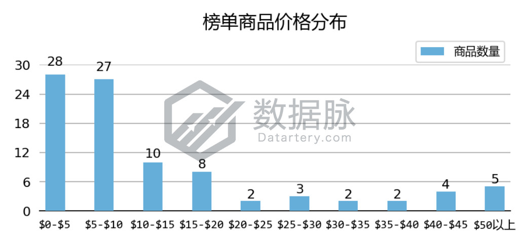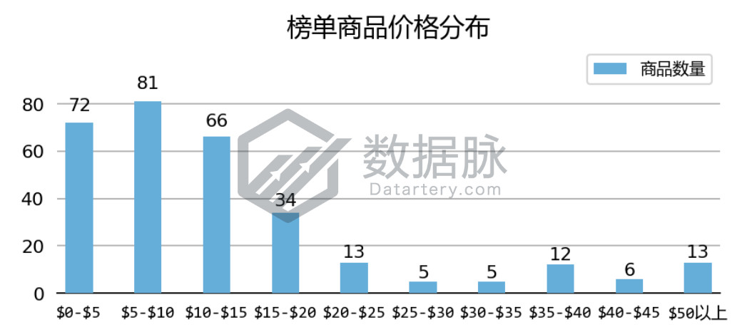 上周 Office Products 品类 Best Seller 榜单商品最高价$69.99, 最低价$0.70,平均价格$14.49。骆探长(shujumai.com)发现,在上榜的商品中, 上榜商品主要集中定价于$0.00-$10.00价格段,其中有30.77%的上榜商品价格分布在$0.00-$5.00区间,同时定价于$5.00-$10.00区间的上榜商品也占据了上榜商品总数的29.67%。骆探长(shujumai.com)发现,相较于前几期分析,该周进榜商品的平均价格下滑之势止住;此外,上周共有5款上榜商品的定价超过了$50.00,占上榜商品总数的5.49%。