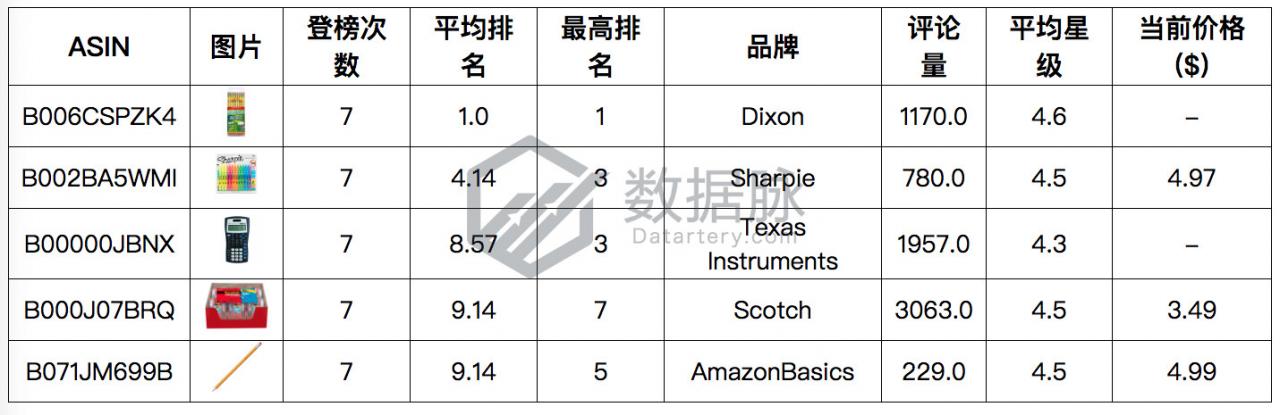 可以看到,在上周Office Products品类的Best Seller榜单中, 品牌Dixon的木质石墨铅笔套装,继上期出色榜单表现,本期连续七日登顶榜首,以平均排名1.0位列综合排名第一;