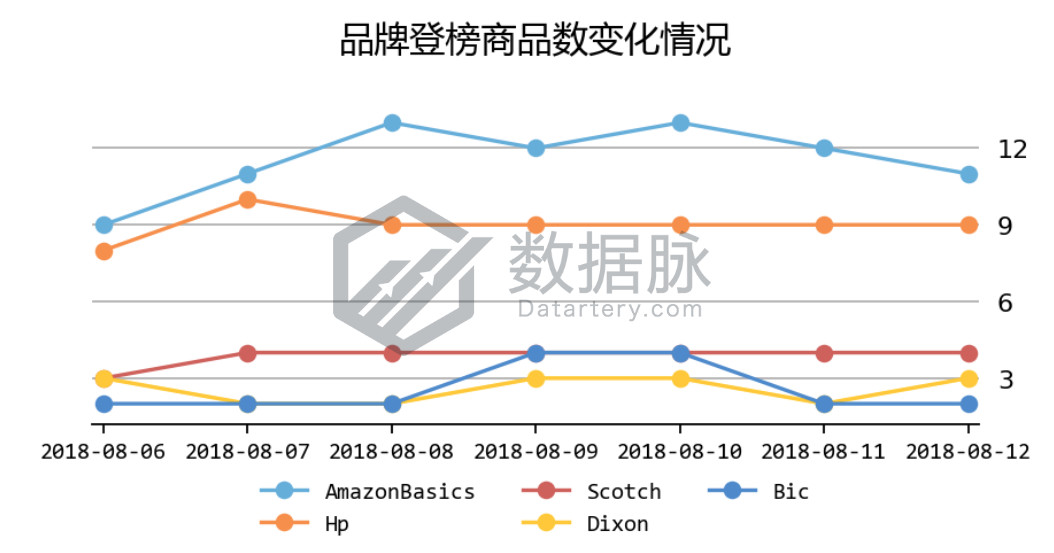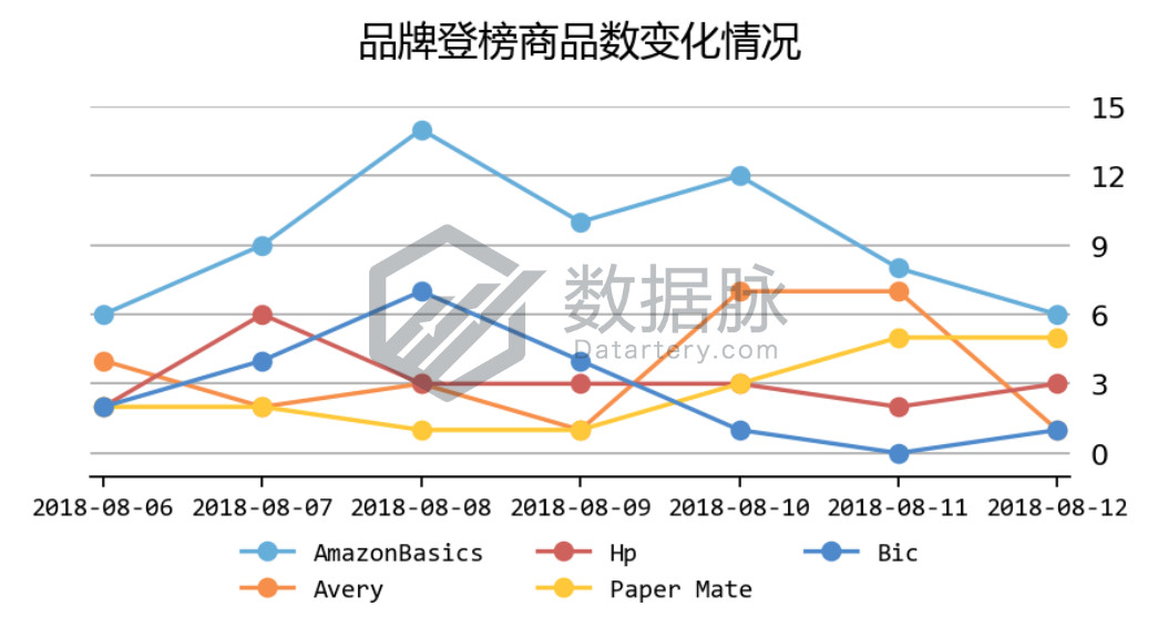 可以看到,在上周Office Products品类的Movers & Shakers榜单中, 骆探长(shujumai.com)也同时注意到,各品牌登榜商品数波动较大;品牌AmazonBasics凭借8月8、9、10日登榜至少10款商品,以总计登榜65次胜出,位列品牌综合排名第一;品牌Avery与品牌Hp之间竞争激烈,均登榜16款商品,但Avery取得了登榜25次进榜机会,位列品牌综合排名第二。