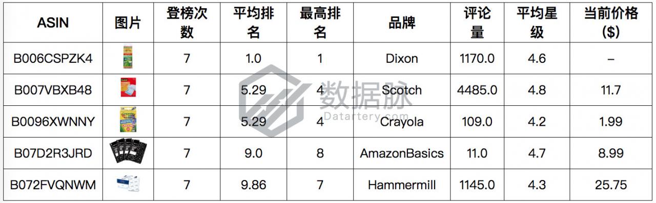 可以看到,在上周Office Products品类的Hot New Releases榜单中, 品牌Dixon的木质石墨铅笔榜单战绩出色,连续一周占据榜单第一,以平均排名1.0位列综合排名之首;